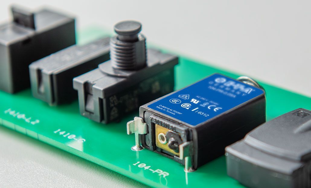 The tripping element of this circuit breaker is a high-quality strip bimetal. It provides a delayed trip curve, which makes the 104-PR the ideal overcurrent protection solution for motors and transformers. In many cases, the circuit board serves as a power distribution unit. The special advantage: Compared to temperature limiters - which must be installed close to the heat-generating loads - E-T-A’s current-carrying 104-PR circuit breaker can be positioned anywhere in the appliance or machine. This means that the mounting PCB can also be installed in any position.