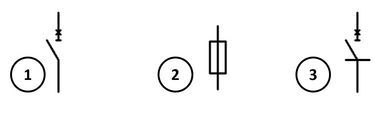 Symbol number 1 shows a circuit breaker with insulation capability in accordance with IEC 60947 Part 2. Symbol number 2 is assigned to a fuse. Finally, symbol number 3 shows a semiconductor circuit breaker (SCCB) in accordance with the draft of the future IEC 60947-10.