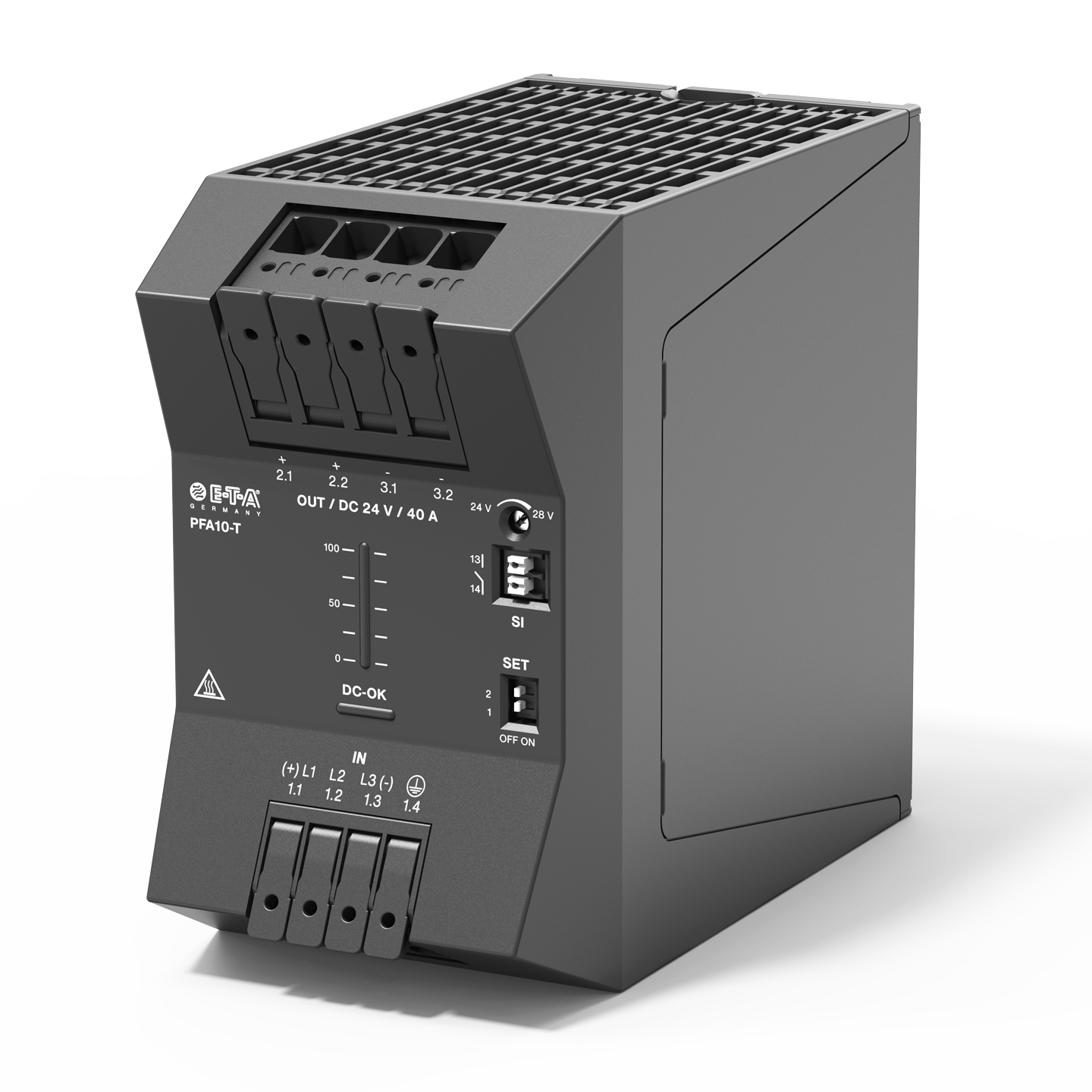 The primary pulsed PFA10-T switch mode power supply unit is ideal for automation and mechanical engineering applications. The compact design allows space-saving integration in control cabinets with limited installation space. The housing with 25° inclined connections enables tool-free installation and quick replacement.